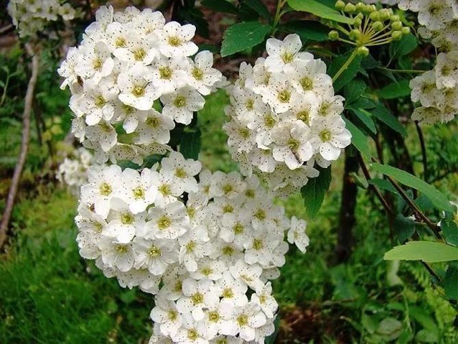 - Раннего срока цветения (апрель-июнь) – у них на прошлогодних побегах появляются цветы, собранные в маленькие белые зонтики.