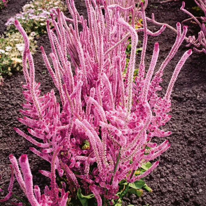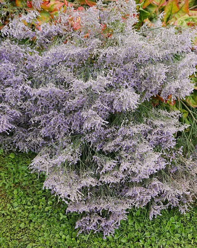 Кермек татарский алый (Limonium tataricum) – многолетний вид, очень маленькие цветки расположены на верхушках побегов красиво изогнутыми односторонними колосками (высотой 40 см). Цветки белые с нежно-розовым оттенком, середина розового цвета. Когда статица цветет (июль-сентябрь), весь куст напоминает нежное облако. Вид устойчив к низким температурам, может долгие годы расти в правильно выбранном месте.