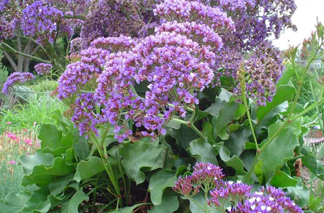 Кермек широколистный (Limonium latifolium) – наименее популярный вид, также культивируемый как многолетнее растение. Цветки очень мелкие, обычно розово-пурпурного цвета, собраны в не слишком густые метельчатые соцветия на верхушке ветвистого восходящего побега (высотой 60 см). Цветки кермека широколистного больше ассоциируются с цветками гипсофилы, являются очень красивым дополнением к сухим букетам и свежим цветочным композициям. Цветы расцветают с июня и цветут до поздней осени. Вид относительно устойчив к низким температурам.