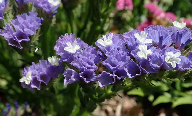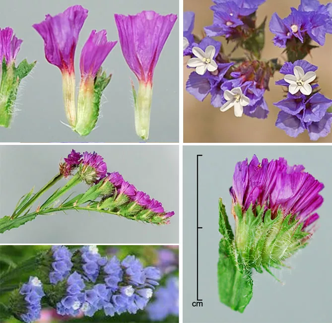 - Цветы – маленькие (4-10 мм), имеют 5 лепестков. Собраны по несколько штук в небольшие колосья на цветоносах. От основания лепестков вырастают 5 тычинок. Цвет самого цветка почти белый, а цвет сухой чашечки определяет декоративную ценность. У разновидностей он бывает темно-синий, белый, в оттенках желтого, розового, карминного, темно-синего.