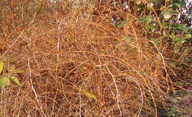 Фото. Зимой на кустарнике декоративно выделяются утолщенные, коричневатые, дугообразные побеги, привлекающие внимание в зимнем саду.