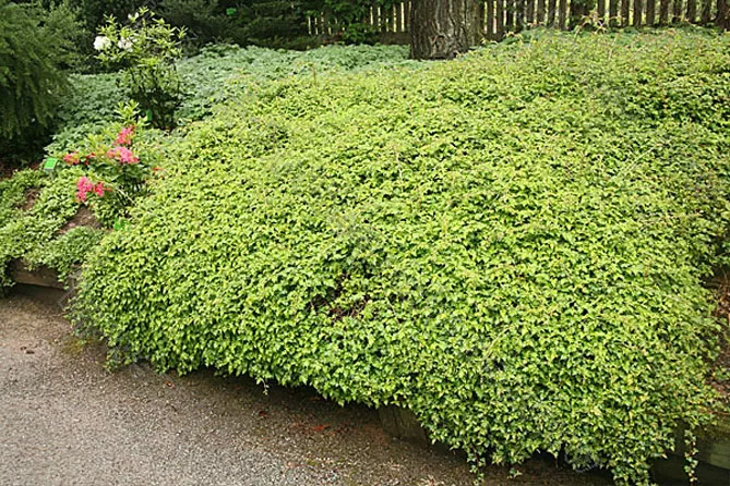 Сорт представляет собой небольшой кустарник, родственный спирее, с невысоким и очень раскидистым габитусом, который творит чудеса в качестве почвопокровного растения.