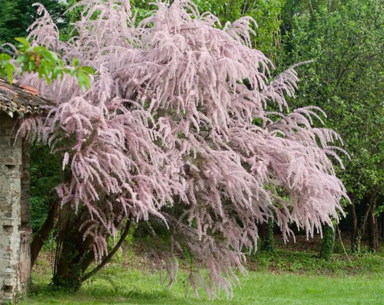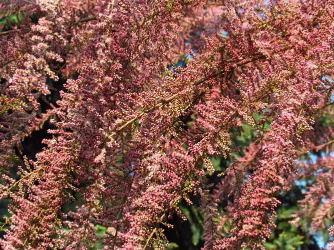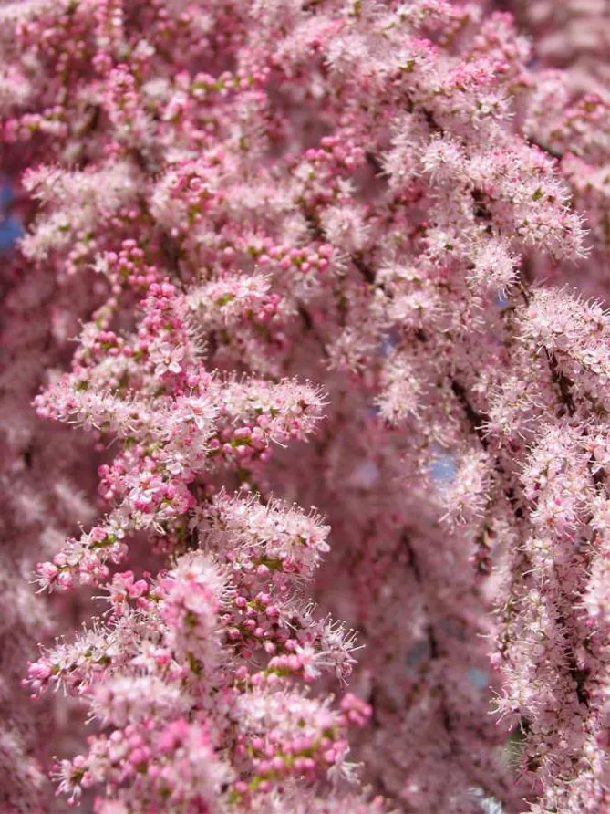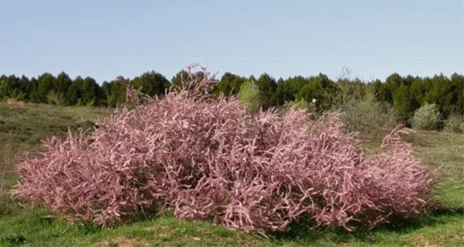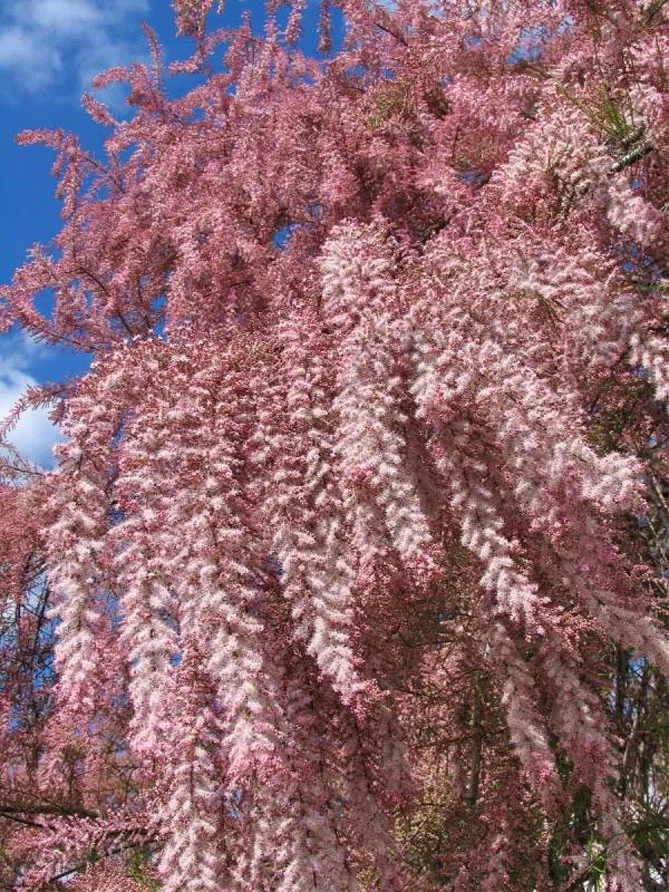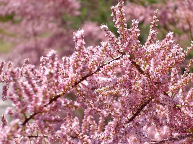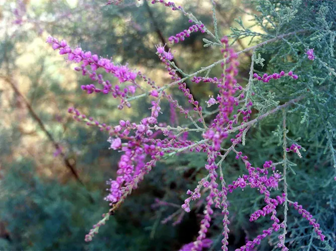 Тамарикс мелкоцветковый (Tamarix parviflora) – высокий кустарник, достигающий 4 м в высоту. Состоит из тонких, многочисленных побегов, покрытых мелкими листьями. Период цветения – весна. Цветки бледно-розовые, образуют симпатичные соцветия. Листья мелкие, чешуйчатые. Цветы появляются весной на побегах прошлого года, поэтому профилактически обрезать куст не рекомендуется.