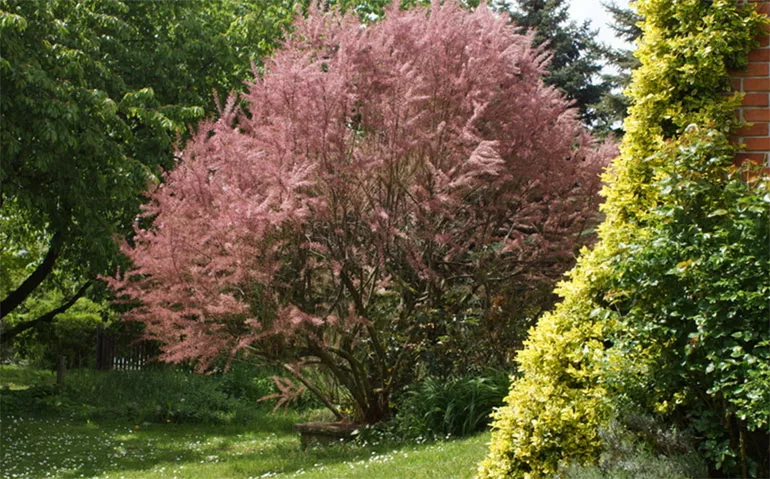 Не стоит сажать тамариксы вместе с кустарниками с крупными цветами и разноцветными листьями, на их фоне тонкая красота тамариксов будет незаметной.