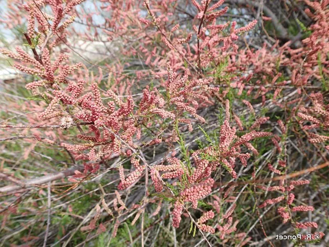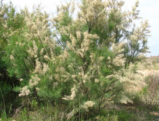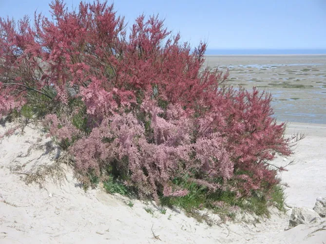 Гребенщик африканский (Tamarix africana) вырастает до 2-5 м в высоту. Розовые цветы развиваются в мае. Листья чешуйчатые, опадающие на зиму.