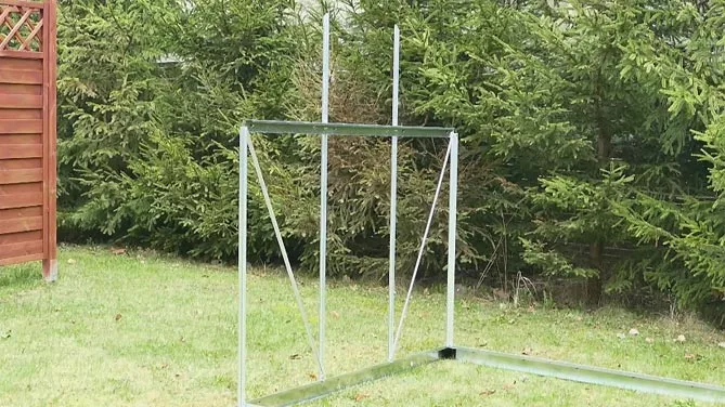 Одним из способов сборки легкой теплицы является рытье ям и встраивание анкеров в бетон. На этом этапе перед заливкой бетона стоит построить нижнюю раму и закрепить на ней анкеры. Благодаря этому, прежде чем заливать якорь бетоном, мы сможем проверить правильность установки теплицы, используя уровень и линейку.