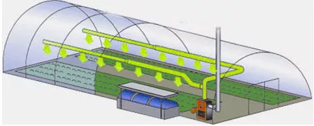 - Отопление воздухом. Для этого используют нагревательный элемент (это может быть печь на дровах, газовый обогреватель и другие приборы) и тепловентилятор с разводкой воздушных потоков.
