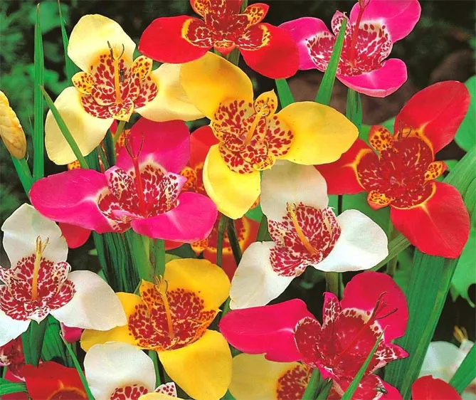- Тигридия «Микс» – часто встречается в продаже смесь сортов с разной окраской цветов. Несколько цветков разных сортов такой смеси постепенно расцветают с конца июля по сентябрь.