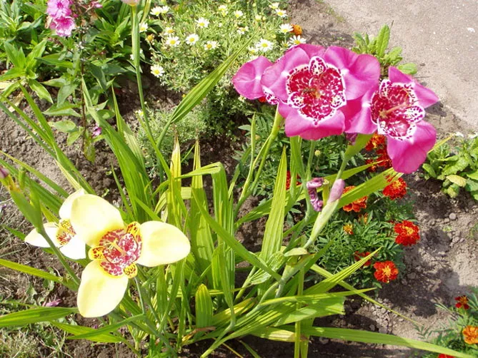 Тигридии красиво выглядят при выращивании среди многолетних растений с темно-красными или серыми листьями. Сорта с красными и желтыми цветками можно посадить рядом с однолетними растениями, цветущими синими цветками – агератум, лобелия.
