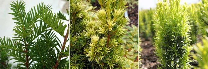 Фото. Листва вида T. Baccata, сортов «Фастигиата Ауреа» и «Ивори Тауэр»