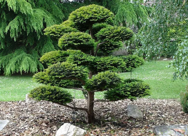Можно придать растению интересную структурированную форму: пирамиду, куб, живую изгородь. Если сформировать его в виде облака, он очень хорошо впишется в японский сад.