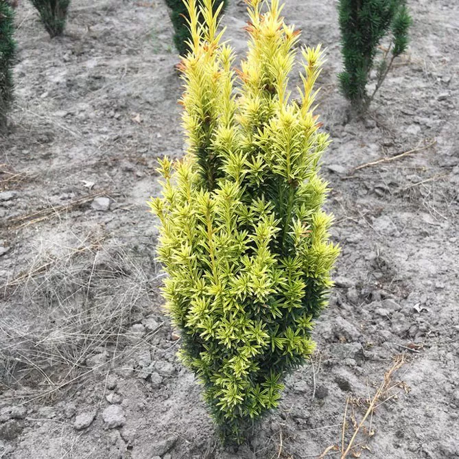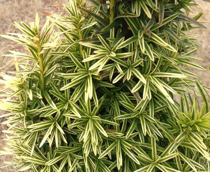 Т. ягодный «Ивори Тауэр» (Taxus baccata Ivory Tower) образует очень узкую, вертикальную колонну, состоящую из декоративной пестрой листвы. Высота в зрелости – 3 м. Летом молодые побеги приобретают желтую окраску, что создает красивый градиент со старой нежно-зеленой листвой.