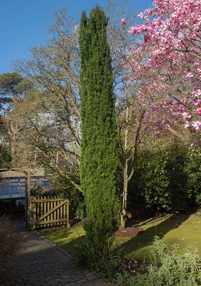 Сорт тиса «Фастигиата Робуста» (T. baccata Fastigiata Robusta) ценится за прямостоячий, столбчатый вид. Высота в зрелости – 3 м. Его не нужно сильно и часто обрезать, чтобы сохранить красивую прямую форму. Стоит посадить растение самостоятельно. Это привнесет структуру и вертикальность в сад.