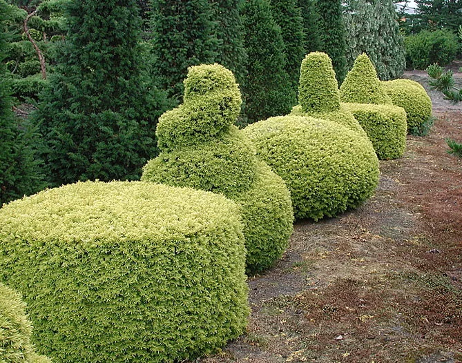 Тис является идеальным растением для формирования топиариев: растет медленно, поэтому требует менее частой обрезки, он ветвистый от основания, имеет густую, вечнозеленую листву, легко может формировать новые веточки на старой древесине.