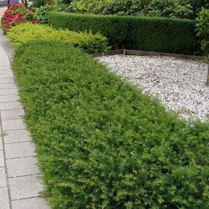 Можно интегрировать тис в сад с другими кустарниками, подстриженными топиариями и клумбами с красочно цветущими многолетниками.