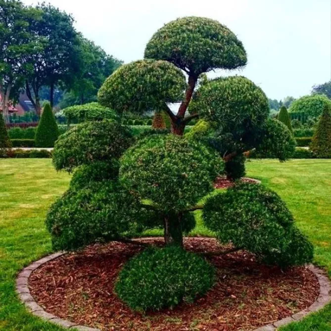 Тис часто используют в топиарном искусстве, так как он очень хорошо поддерживает обрезку. Его единственный недостаток – он растет медленно, но это позволяет реже вмешиваться, чтобы его обрезать.