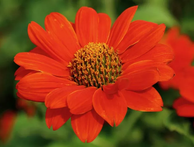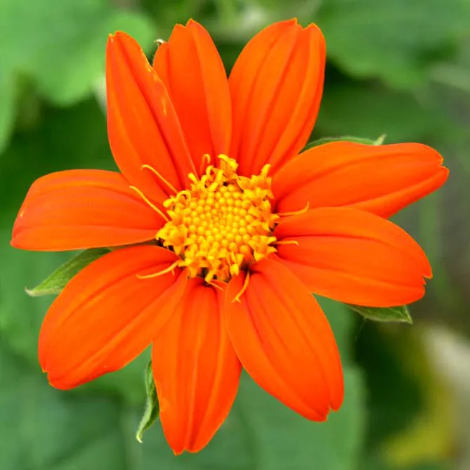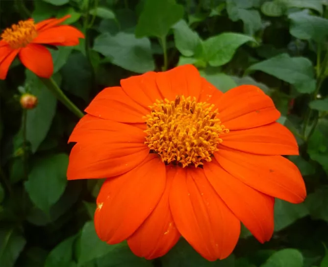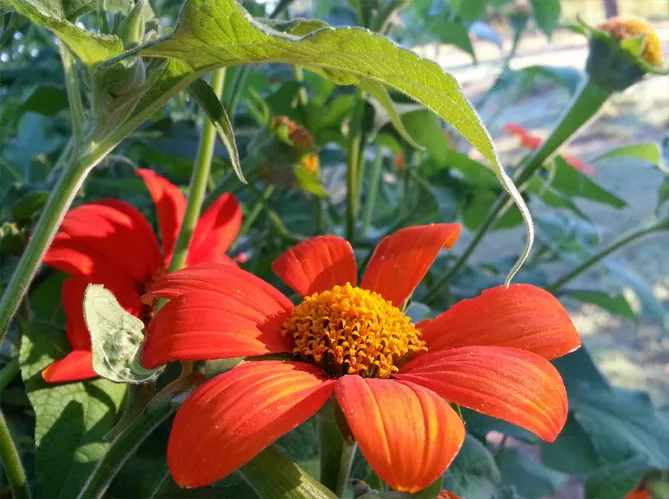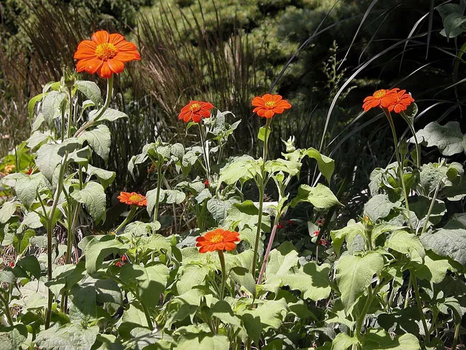 Титония круглолистная – однолетнее растение с прямостоячими, сильно разветвленными побегами. Вырастает до 80-100 см в высоту. Ее крупные, яркие цветы напоминают георгины или подсолнухи.