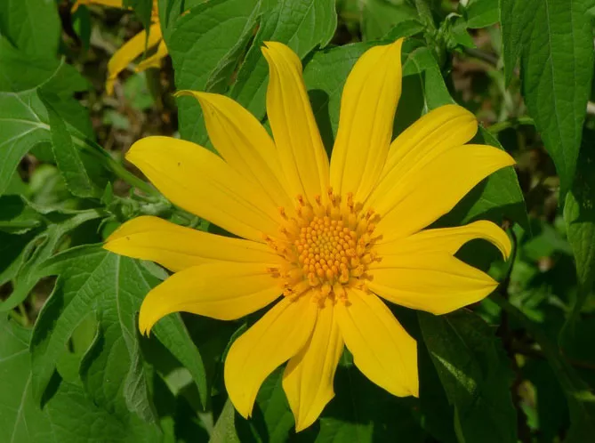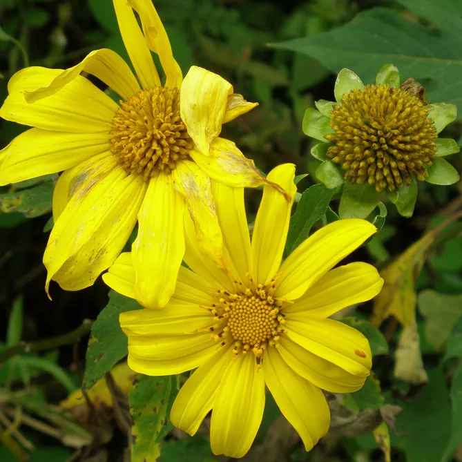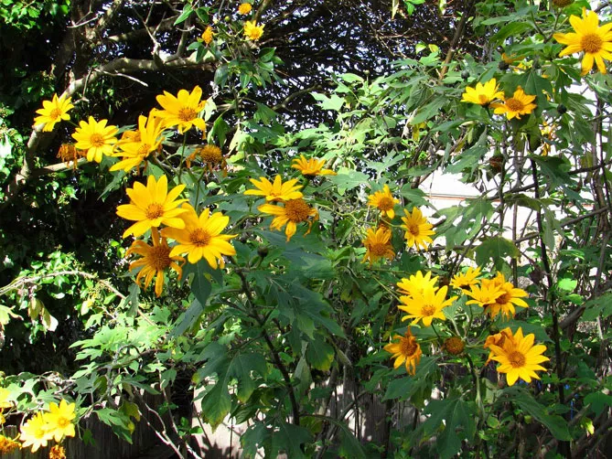 Кустарниковый вид Титония разнолистная (Tithonia diversifolia) в стране происхождения может достигать высоты 2-3 м. Листья темно-зеленые, цветки очень крупные, желтые, диаметром до 15 см. Растение для жаркого климата, имеет очень яркие, крупные цветы.