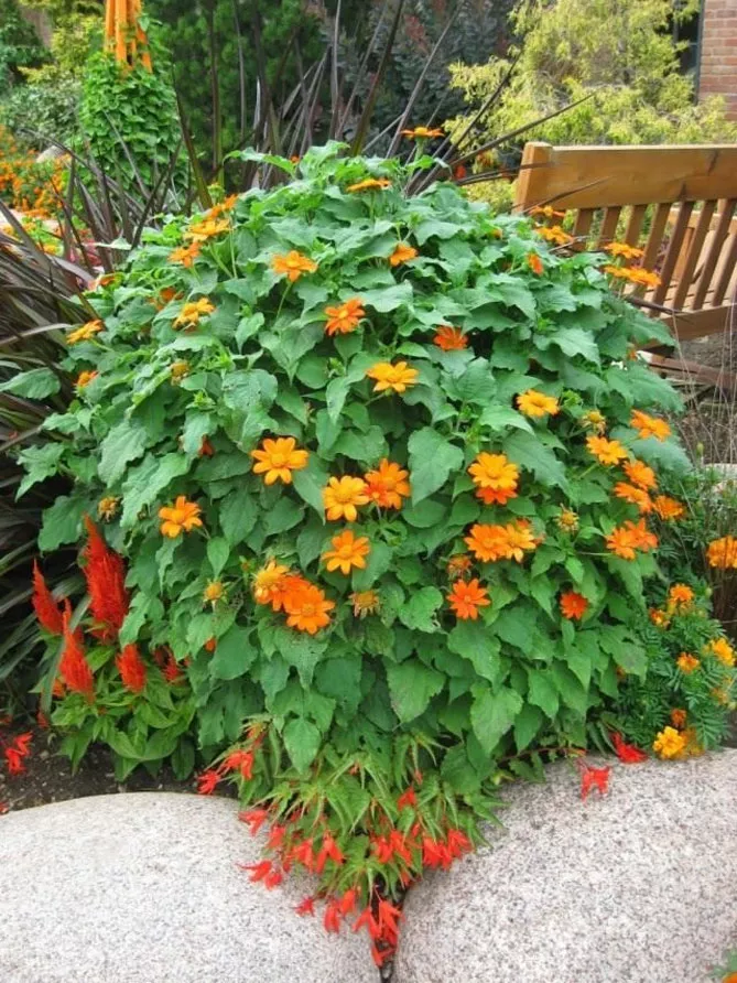 На клумбах и рабатках их можно сажать в центральной части одиночно или небольшими группами, подбирая к ним всю остальную композицию. Ничуть не хуже смотрятся титонии, высаженные на заднем плане, особенно когда за ними однородная зеленая изгородь или стена.