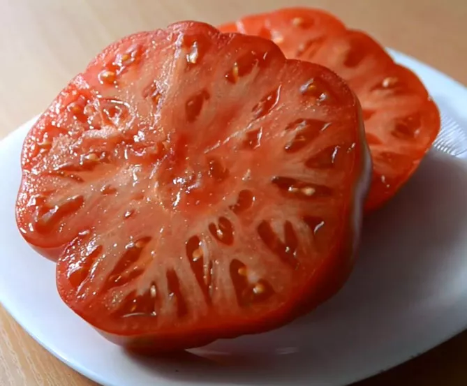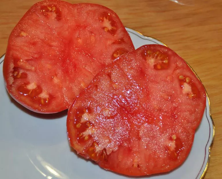 Замечание. Розовый гигант удобно резать ломтями для бутербродов, пластины похожи на парную телятину, из-за чего группа томатов и получила название «биф».