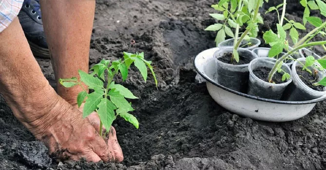 Когда сажать рассаду томатов, подскажет температура грунта. Он должен прогреться до 10 °С для теплиц, при 15 °С можно перемещать помидоры на открытые грядки. В каждую лунку добавляют смесь, составленную из равных долей: