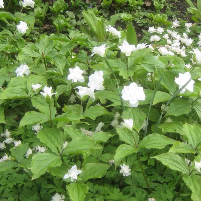 Великолепный сорт махрового триллиума «Флоре Плено» грандифлора или крупноцветкового вида (Trillium grandiflorum Flore Pleno) отличается красивыми цветками чисто-белого цвета. Период цветения: март-апрель. Высота – 25 см.