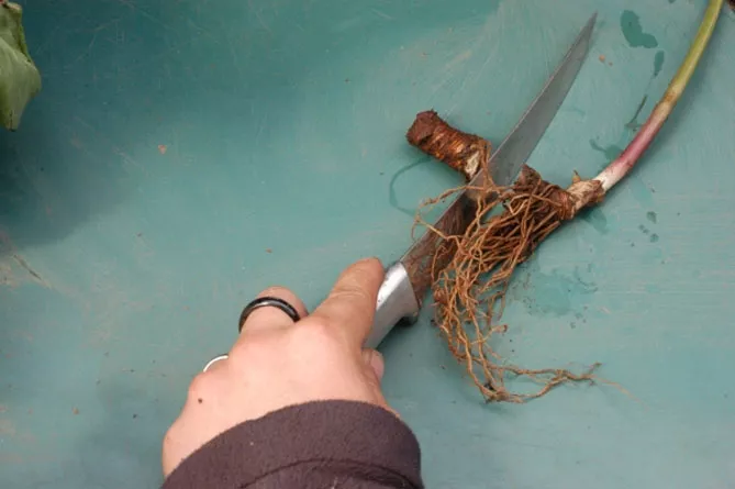 - С помощью ножа продезинфицированного для предотвращения распространения болезней, разделите корневище на несколько фрагментов. У всех должен быть спящий глазок.