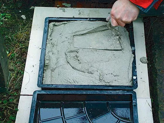 Заполняя форму, наливаем определенное количество раствора в центр и распределяем мастерком. Под давлением мастерка раствор становится пластичным, распределяясь должным образом. После разравнивания форма будет равномерно заполнена.