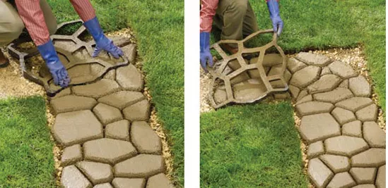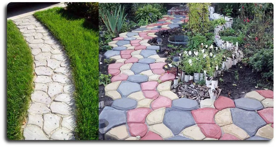 Фото. Виды садовых дорожек, выполненные с использованием различных форм и красителей для бетона при производстве плитки.