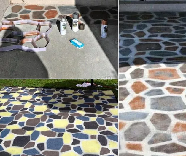 Если нет желания экспериментировать с бетоном, можно купить готовые, простые, серые бетонные квадратные плиты и украсить их декоративно при помощи краски в баллончиках.