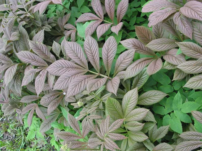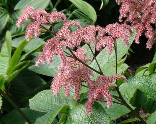 Роджерсия бузинолистная обнаружена в начале 20 века в Китае. Это самый маленький из всех видов – вырастает примерно до 50 см. У многолетника перистые листья, зеленые летом и осенью, похожие на листья бузины, с чем и связано название.