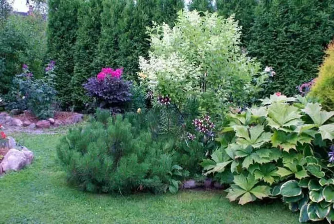 - рододендроны (сорта «Rubinosa», «Album Novum», «Goldkrone»);
