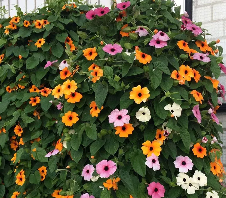 Тунбергия является чрезвычайно обильноцветущим растением. В теплую и солнечную погоду развивает настоящие цветочные каскады. Независимо от того, является ли растение классическим видом тунбергии с желтыми, оранжевыми, пастельными цветами или совершенно новым сортом, цветущим розовыми цветами – все лето лианы создают плотную завесу из листьев с веселыми, яркими цветами на их фоне.