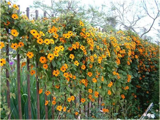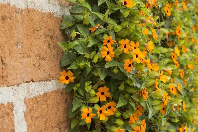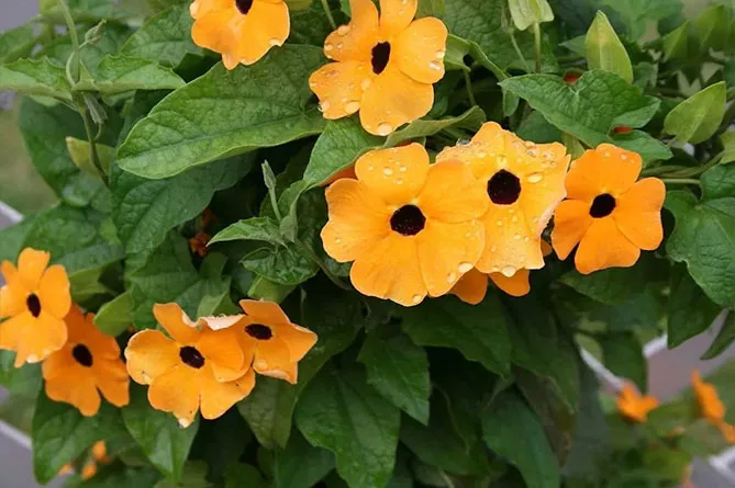 - Тунбергия крылатая (лат. Thunbergia alata) – красивая лиана, ценится за ярко-оранжевые цветки с темным центром и темно-зеленые зубчатые матовые листья.