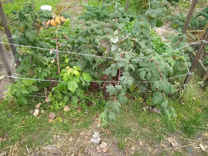 Кусты малины лучше подвязывать к кольям или шпалере в первый год выращивания. Можно самостоятельно подвязать к проволоке побеги – благодаря этому они лучше разрастутся и не будут висеть над землей. Крепится одна проволока на высоте 1 м от уровня земли, к которой подвязывают побеги малины.
