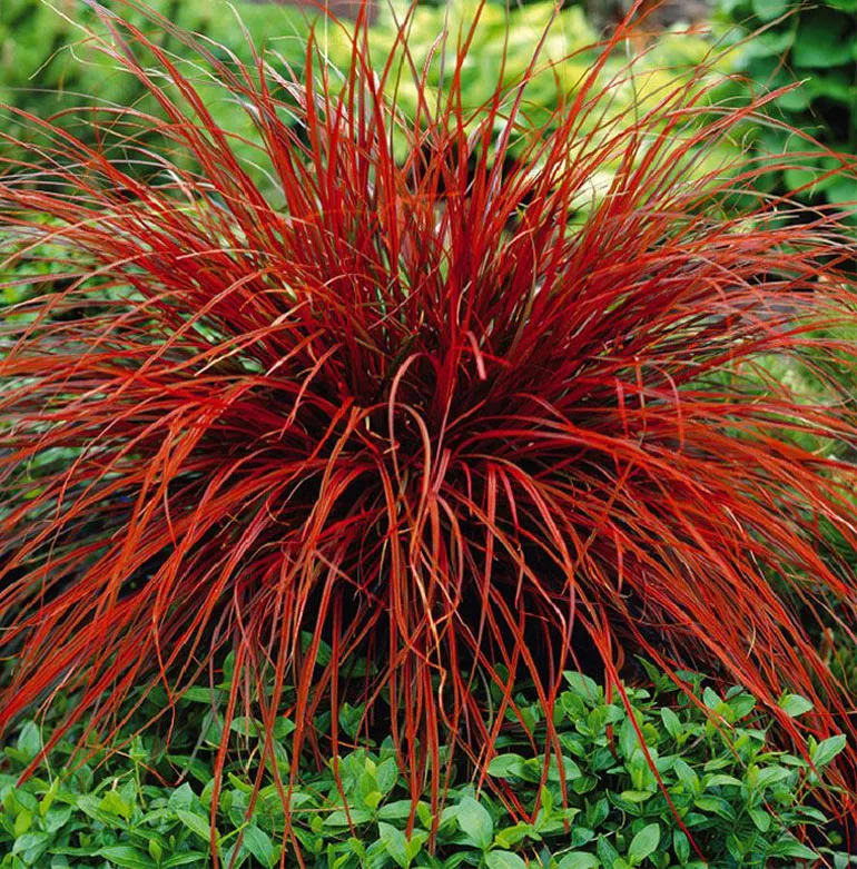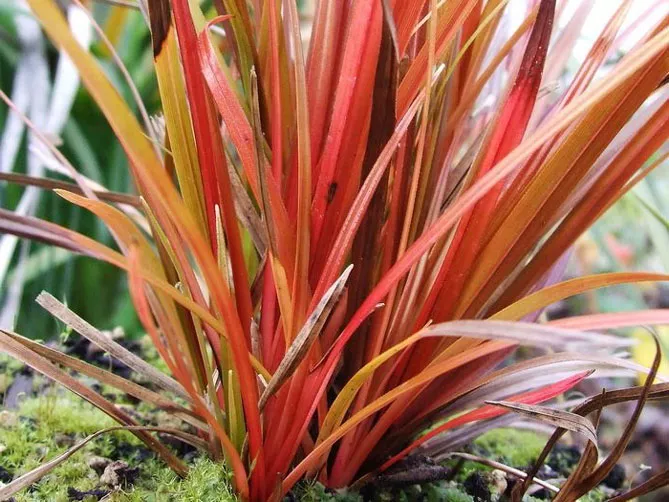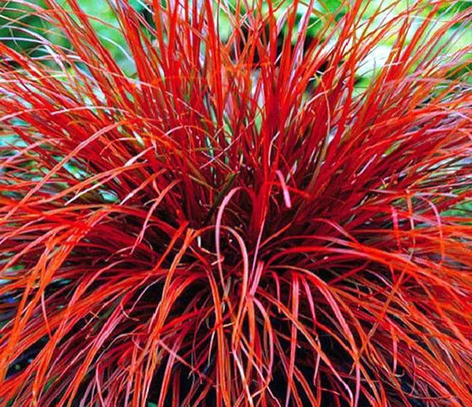 Унциния рубра – это компактный, густой, изящный многолетник с травянистой внешностью. Он отличается очень декоративными лентовидными листьями оранжево-красного или бронзово-фиолетового цвета. Летом дополнительным украшением служат черные соцветия, контрастирующие на фоне ярко-красных листьев. Это похожее на осоку растение в саду используют в оформлении солнечных клумб, прудов, альпинариев.