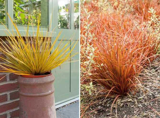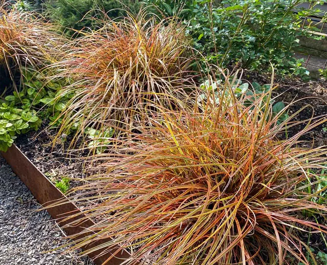 Палитра теплого цвета листвы этой травы «разбудит» растения, сопровождающие его во влажных местах: