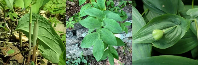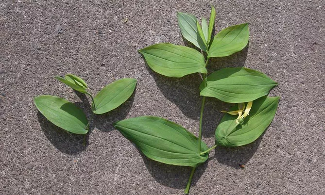 Фото. Листья и плоды увулярии. Молодые побеги, начинающие рост весной, с развитой листвой и капсулой, содержащей семена.