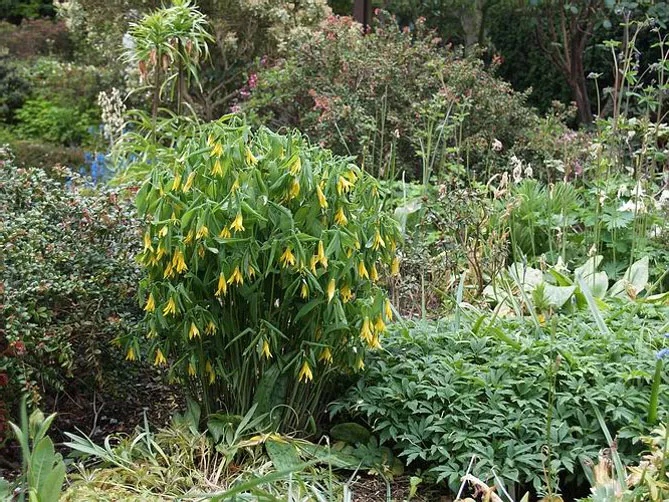 Ценящая кислые почвы увулярия легко впишется в массив вересковой пустоши в компании с ацидофильными кустарниками: