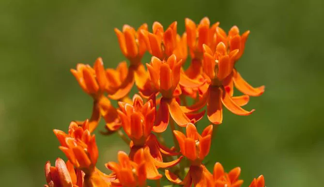 Летом, примерно с середины июня по август, на верхушках побегов появляются многочисленные оранжевые цветки, собранные в плоские грозди. Они очень своеобразны – 5 лепестков имеют типичный вид, а остальные пять закручены в виде загнутых вверх капюшонов с характерным коническим выростом.