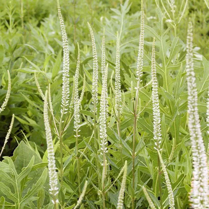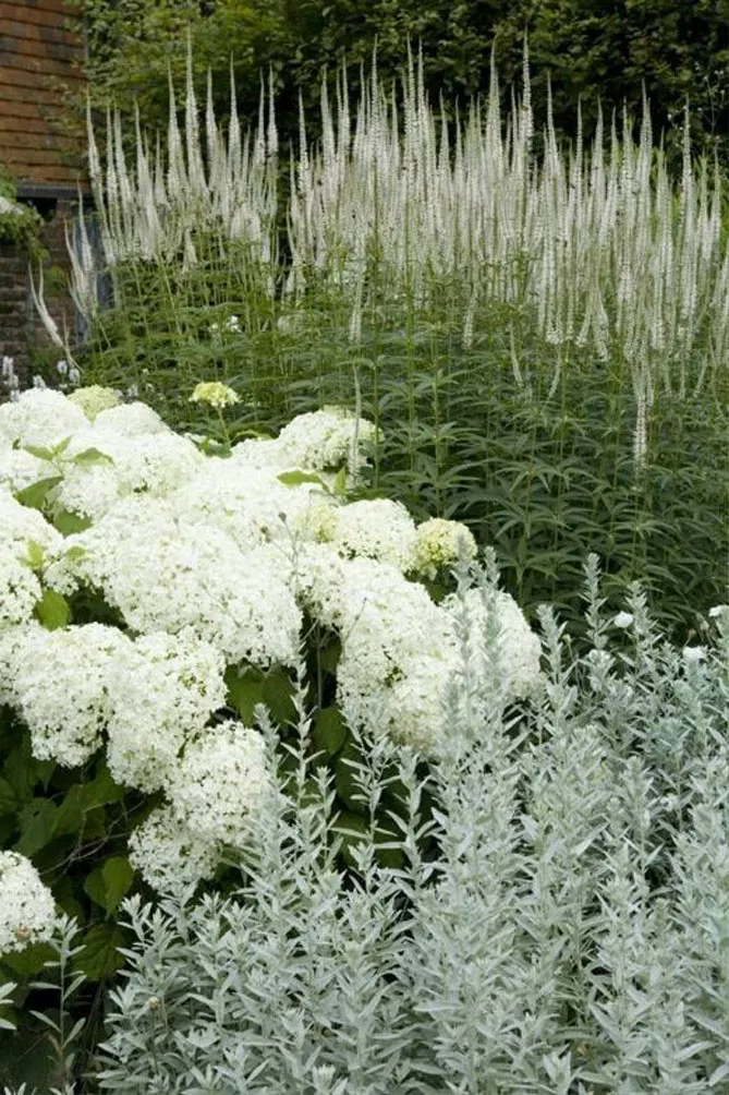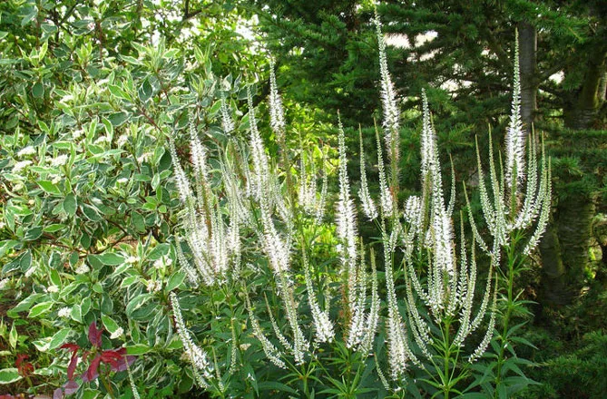 Сорт вероникаструма «Альбум» (Veronicastrum virginicum var. Album) цветет с июля по сентябрь. Высота – 1,2 м. Хорошо подходит для легкого сопровождения декоративных растений с яркими цветами и светлой листвой. Идеален в задней части клумб.
