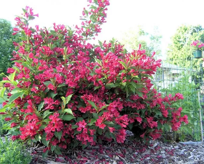 | Вейгела «Ред принц» (Red Prince). Медленнорастущий, густой кустарник, растущий до 1,5 м. Зеленые листья, красные колоколообразные цветки появляются с июня по сентябрь. Предпочитает солнечные или слегка тенистые места. Морозостойкость: -20 °С. | ![]() |