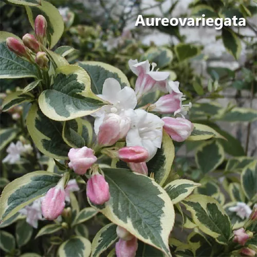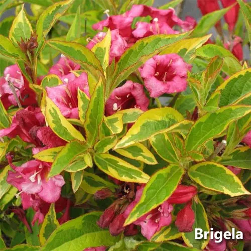 | Заслуживают внимания сорта «Brigela» и «Aureovariegata», листья которых украшены светло-желтыми полосками по краям. Их цветы розовые, очень выразительные на фоне более светлых листьев. | ![]() ![]() |