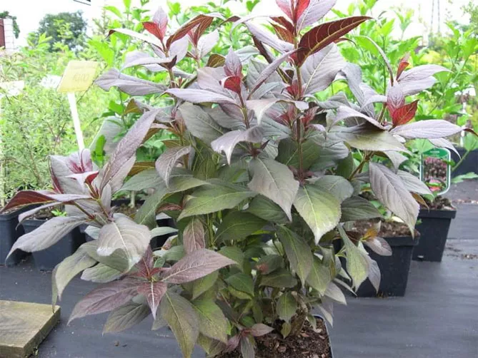 | Вейгела «Александра» (Alexandra). Характеризуется меньшей высотой, более компактной кроной. Кусты высотой 2 метра. Сорт отличают уникальные фиолетовые листья. | ![]() |