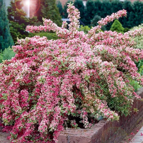 | Вейгела «Нана вариегата» (Nana Variegata). Густой кустарник, медленно растет до 1,5 метров. Листья зеленые с кремовым окаймлением. Цветки колоколообразные, бело-розовые, цветение: июнь-июль. | ![]() |