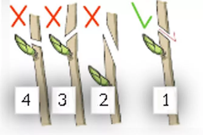 1 – Правильно сделанный срез над почкой, направленной за пределы куста.