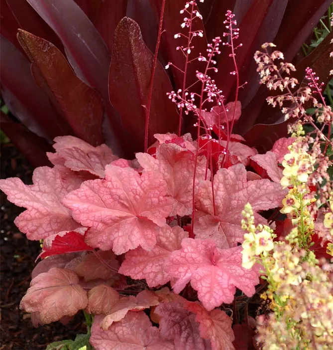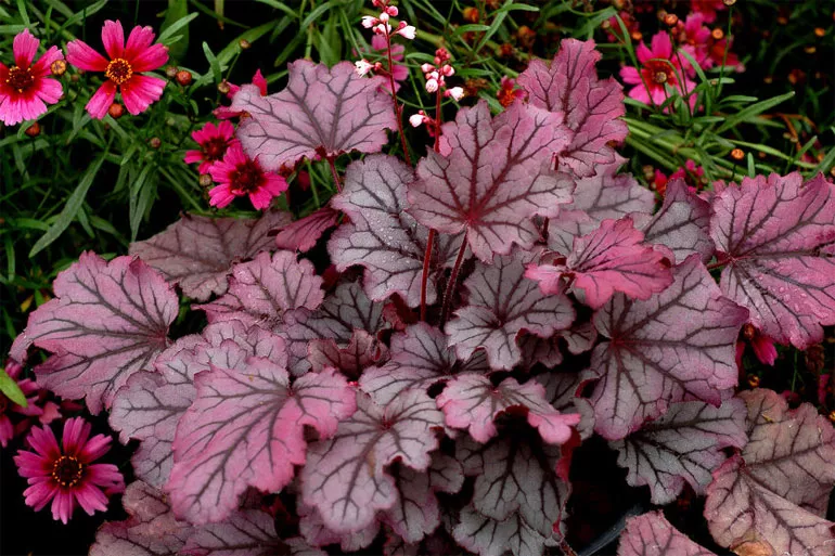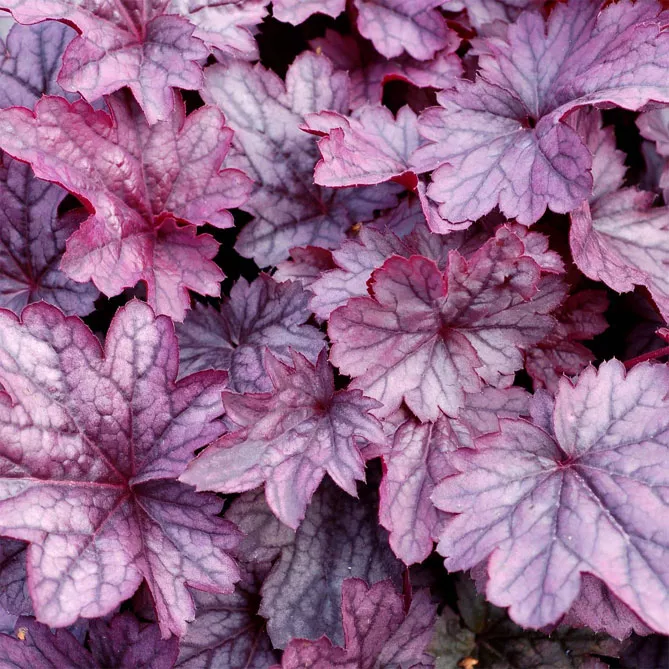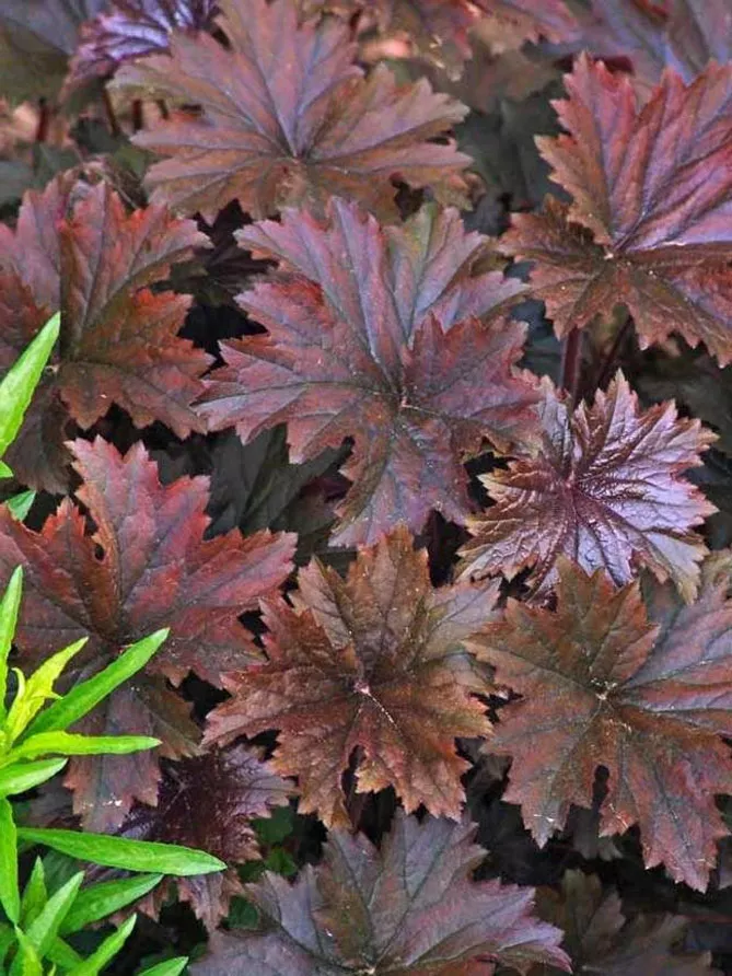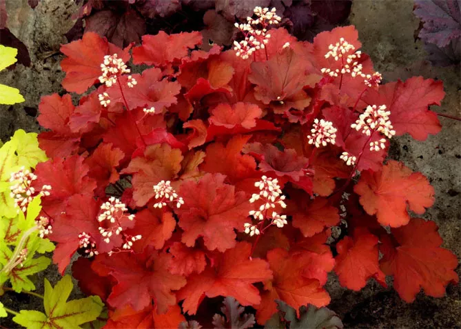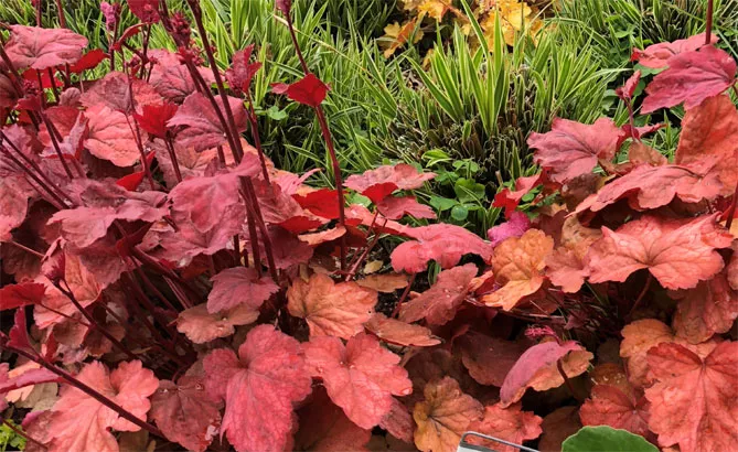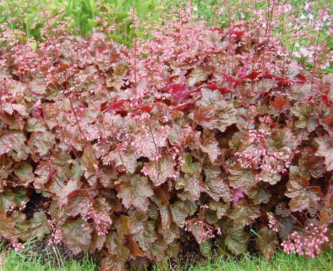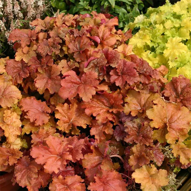 Autumn leaves – яркий, красноватый цвет листвы весной меняется на темно-красный. Гейхера создает идеальный контраст с другими растениями.