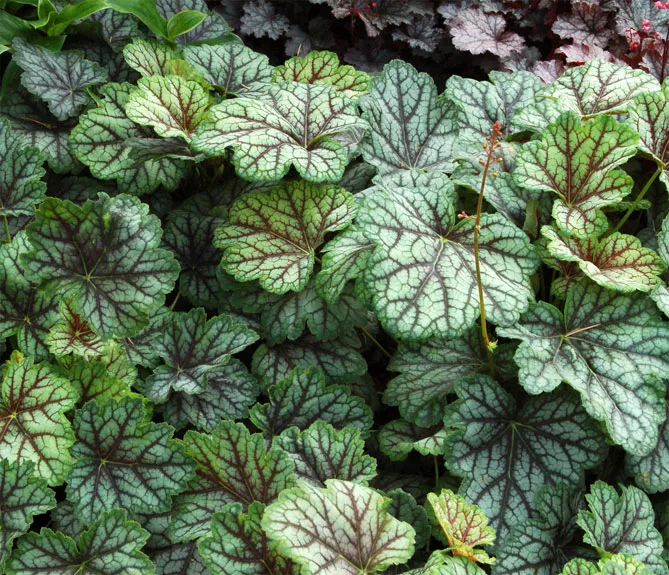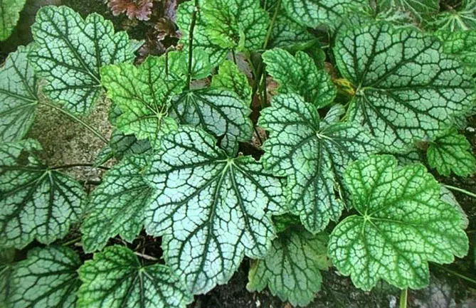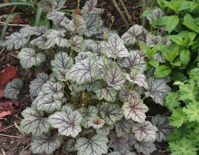 Один из лучших сортов гейхеры с листьями серебристо-зеленой окраски. Главный сортовой признак характерные прожилки темно-коричневого цвета. Цветы молочно-белого цвета. Цветение приходится на начало лета.