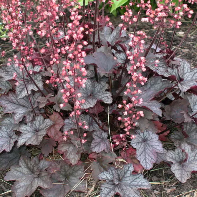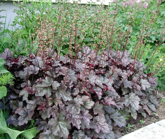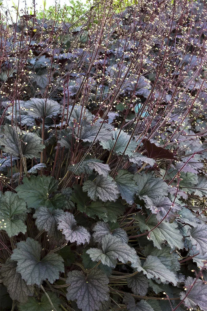 Редкая насыщенно-фиолетовая гейхера. Период цветения приходится на середину лета. Соцветия невысокие, рыхлые с молочными цветами. Высота кустов не превышает 35 см. Подходит для посадки в полутени и на открытых участках. Морозостойкость хорошая.