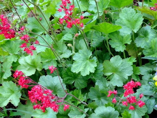 Листовые пластины изумрудно зеленого цвета с характерным мраморным рисунком. Высота кустов около 35 см. В начале июня гейхера выбрасывает высокие цветоносы с кисточками ярко-красных цветов.